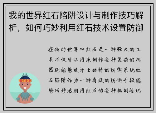 我的世界红石陷阱设计与制作技巧解析,如何巧妙利用红石技术设置防御系统
