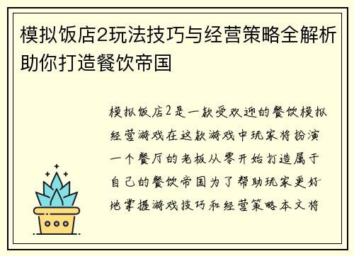 模拟饭店2玩法技巧与经营策略全解析助你打造餐饮帝国