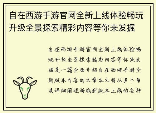 自在西游手游官网全新上线体验畅玩升级全景探索精彩内容等你来发掘