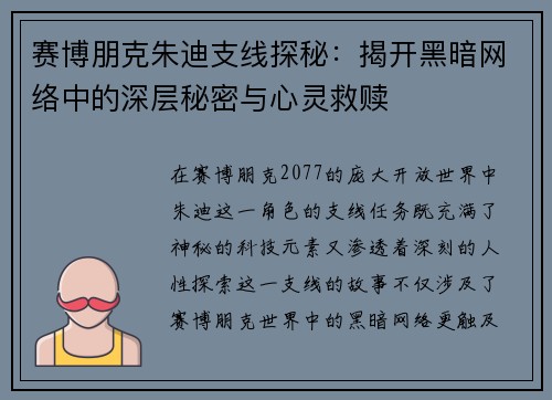 赛博朋克朱迪支线探秘:揭开黑暗网络中的深层秘密与心灵救赎